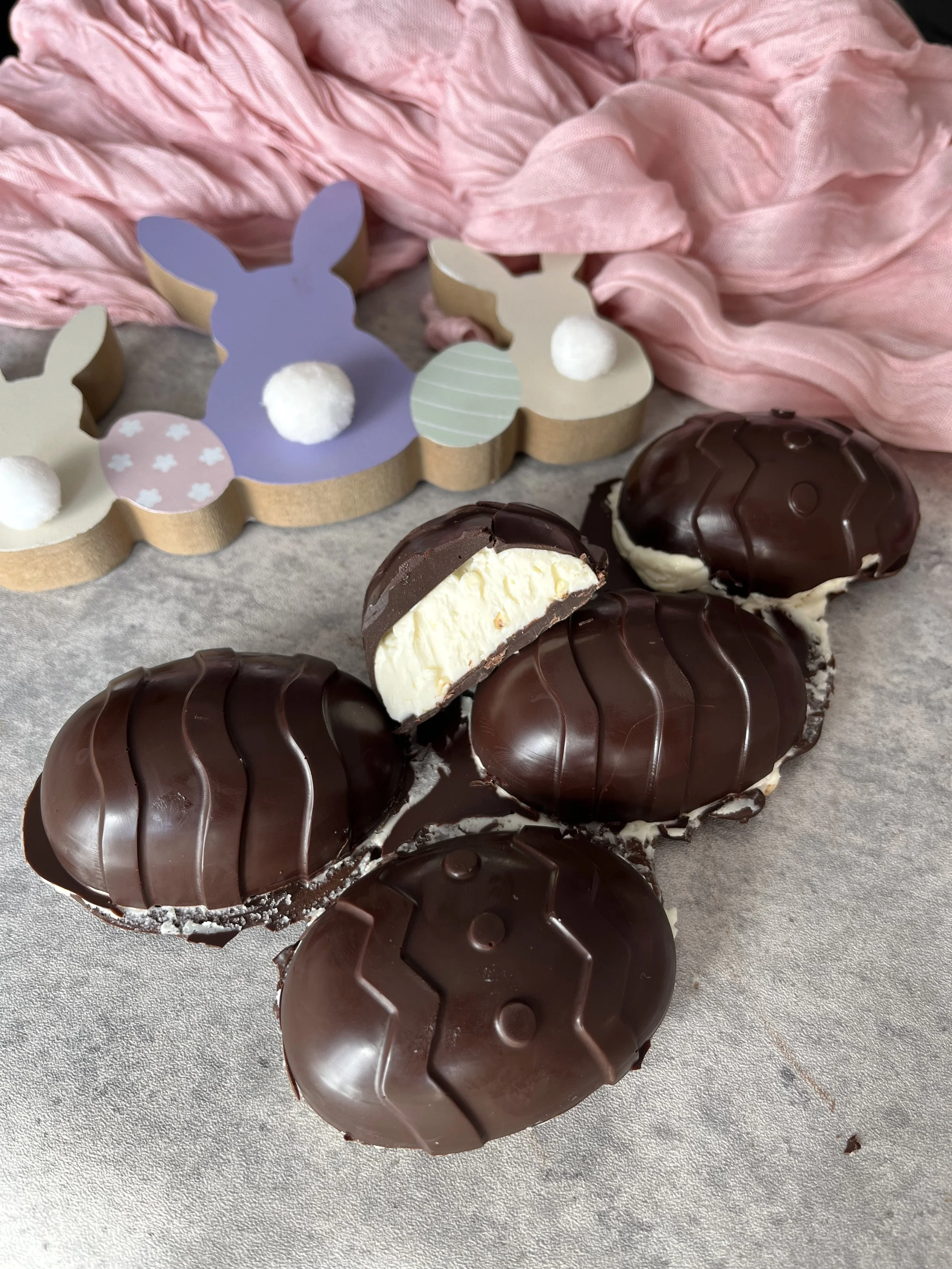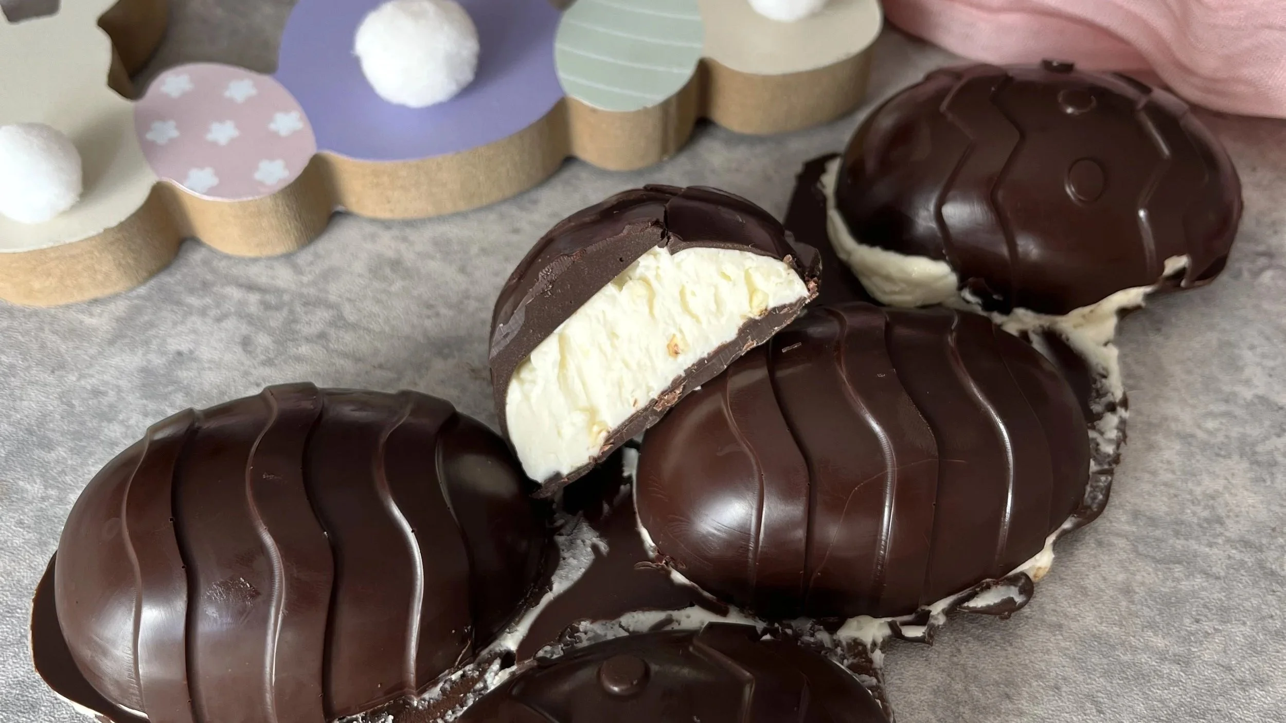 Czekoladowe jajka nadziewane kremem mascarpone z chrupiącą jagłą ekspandowaną to prosty, a jednocześnie efektowny deser na Wielkanoc. Kremowe wnętrze, czekoladowa skorupka i delikatna chrupkość sprawiają, że deser smakuje zarówno dzieciom, jak i dorosłym. Bez pieczenia, szybki w przygotowaniu i idealny jako wielkanocna słodka przekąska lub deser po świątecznym obiedzie.