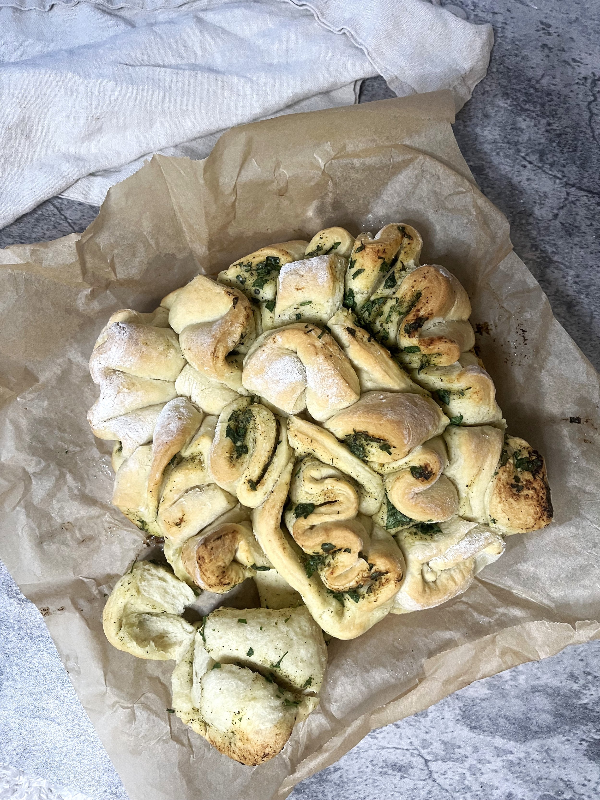 Kiedy ciasto wyrośnie, przełożyć je na blat obsypany mąką, rozwałkować i posmarować masłem ziołowo–czosnkowym. Wyciąć paski, zwijać je tak jak w filmiku, ułożyć na blaszkę wyłożoną papierem do pieczenia. Piec w 180°C (góra–dół) przez około 30–35 minut, aż do zrumienienia.